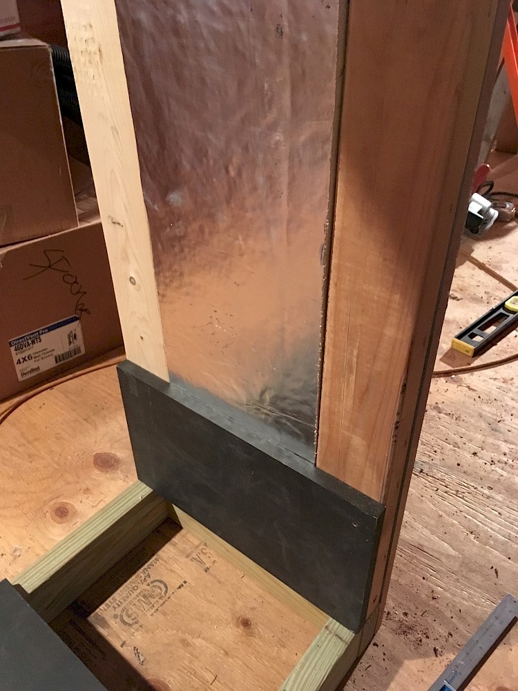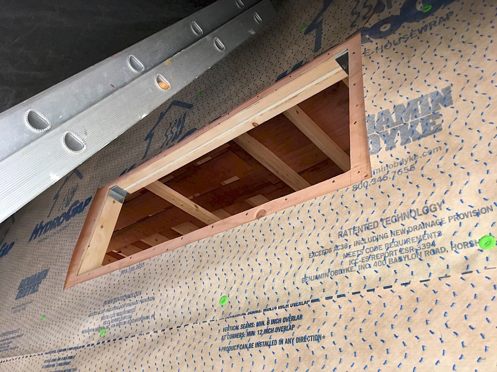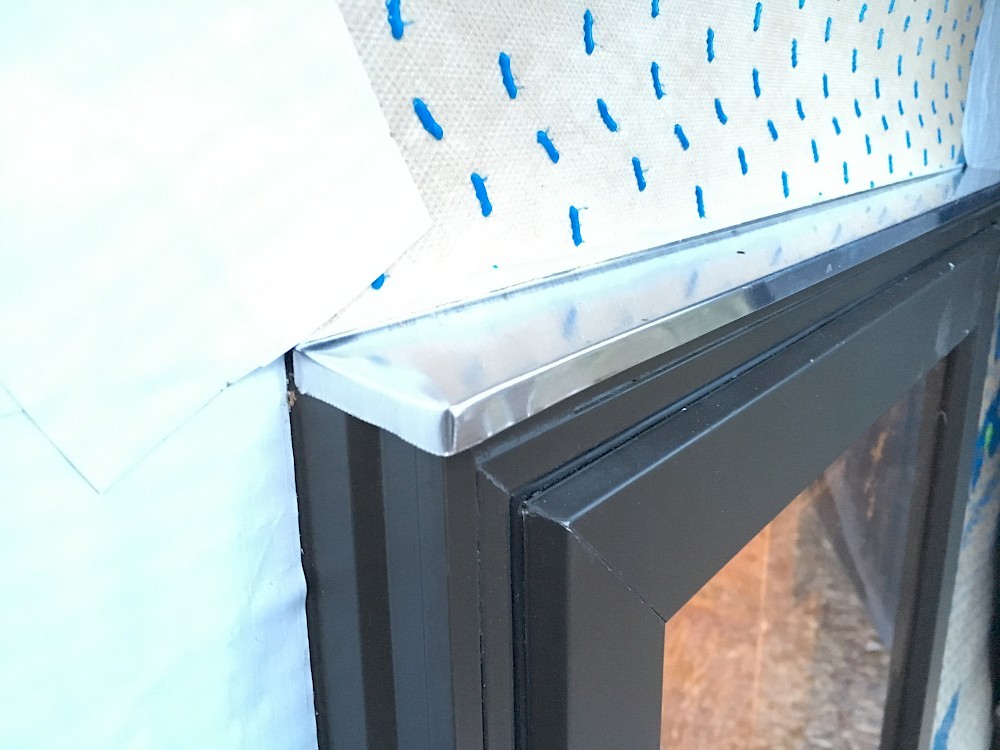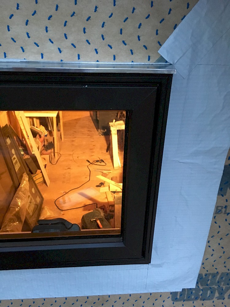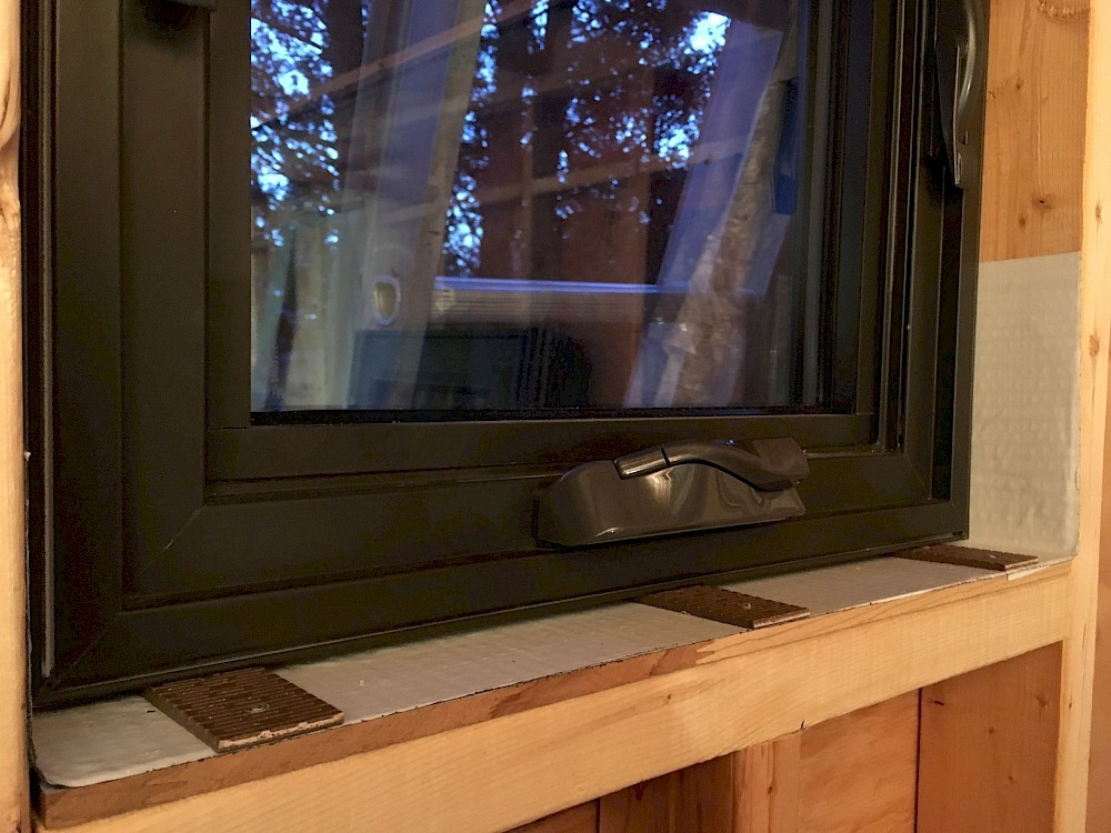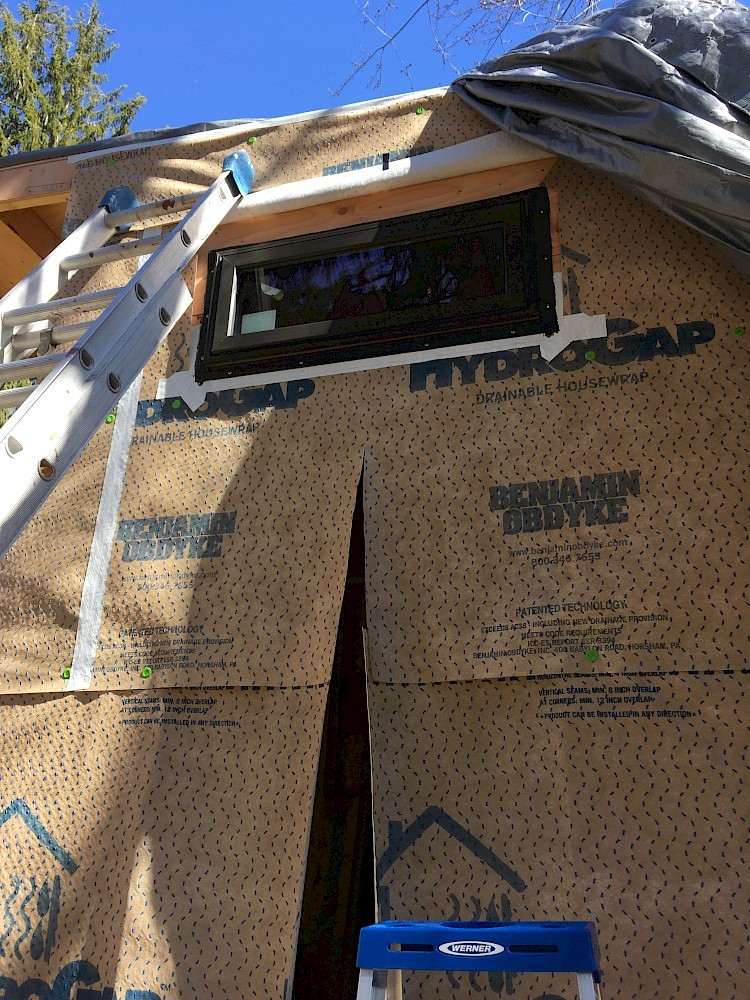 It could be noted at this point that there seem to be some differing ideas about the best techniques for preparing the rough opening to minimize any possibility of leaks around the window. We watched a video that showed one approach to taping the framing and flashing with wide waterproofing tape. Mikey ended up following a somewhat different method specified by the manufacturer of the drainable house wrap, Benjamin Obdyke. The house wrap was cut back 2” on the sides and bottom to allow for optimal adhesion of the window and flashing tape. The flashing was applied ”shingle-style” with the sill covered first, the window flange caulked and mounted, and finally the sides and top flashed. Special attention was given to providing a seamless seal at the two bottom corners of the opening. Two small, wedge-shaped composite shims were placed near each end of the bottom of the rough opening, to keep the window frame both level and slightly raised above that surface. (Some space there is needed to allow any moisture that gets in either to drain out or evaporate freely.) Tacking the shims in place with some small nails proved to be helpful so they wouldn’t get knocked out of place as the window was positioned.