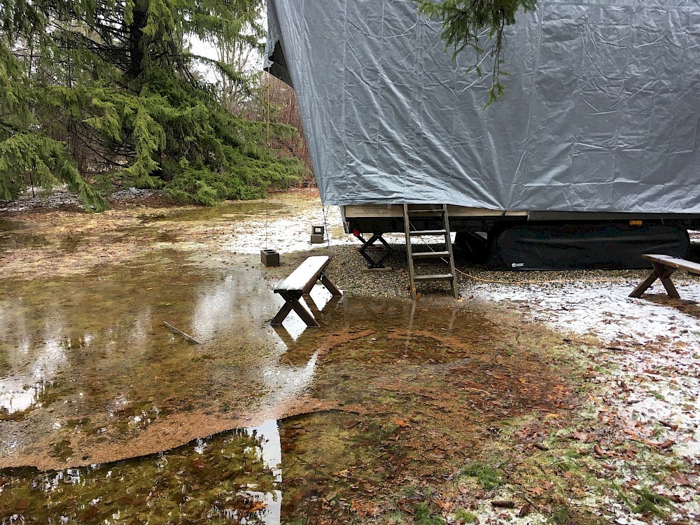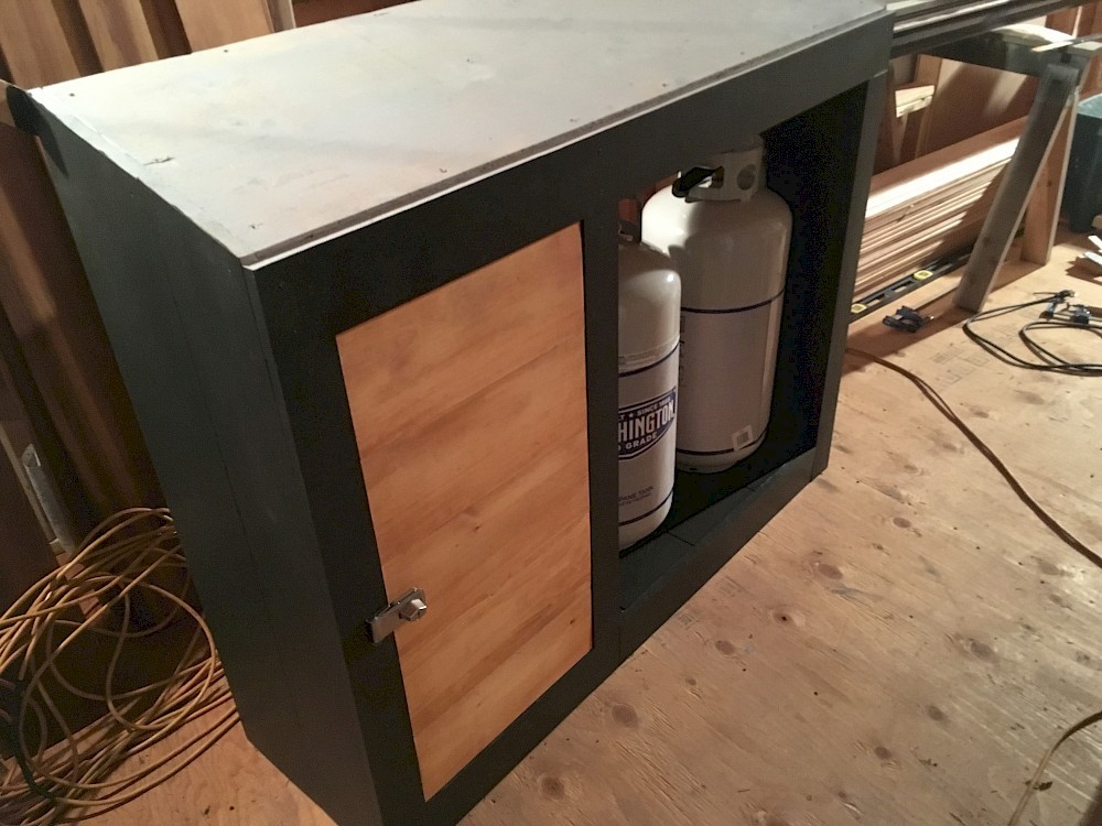 The slow and rather erratic return of warmer weather is stirring the blood of us Tiny House builders! Mikey first braved the chill outside starting on Sunday 3/19, beginning work on the exterior utility box which will rest on the trailer tongue frame and hold the house’s twin propane tanks and a storage compartment for batteries and assorted gear. His first hours of building produced the internal framing for the box and the sheathing for its small pitched roof. At dinner that night, he said “It feels good to be building again.”