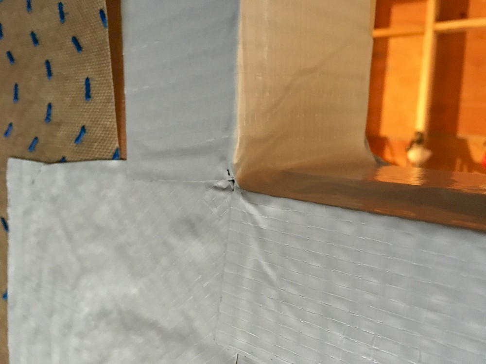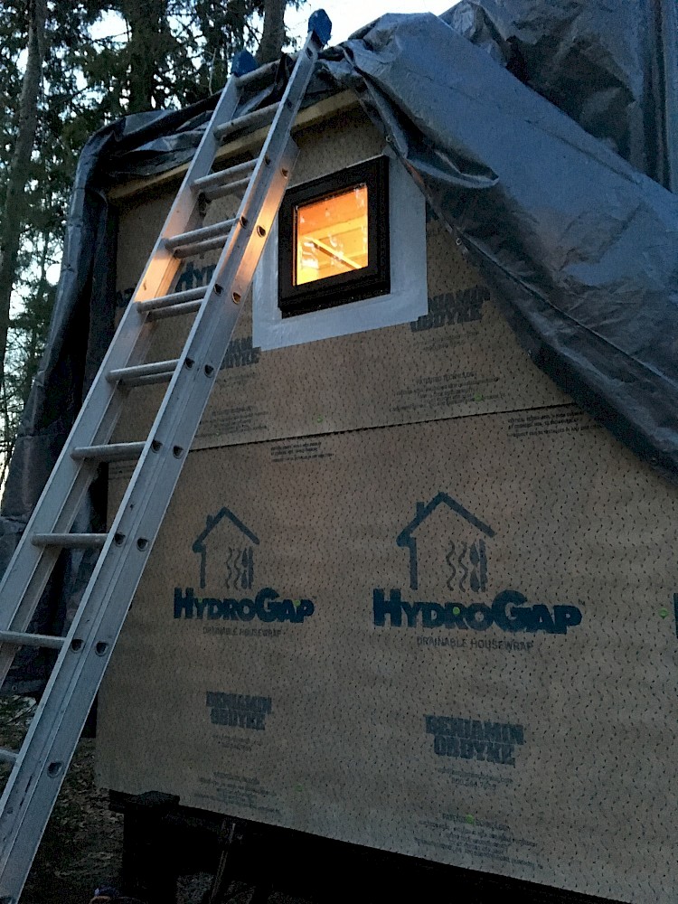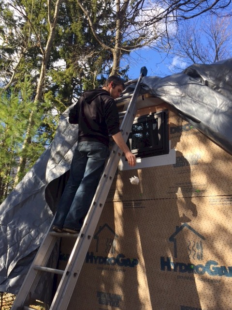 And - at last - he soon started installing the much anticipated windows, which have been waiting in the garage. He began with the smallest: the square, operable one in the center of the bathroom wall, high on the trailer hitch end of the house. Together, the two of us pulled aside some of the gigantic tarp which has draped the whole structure over the winter, revealing again the house wrap wall covering that was a challenge to put up in the fall. Mikey climbed the extension ladder and cut the initial opening in the wrap.