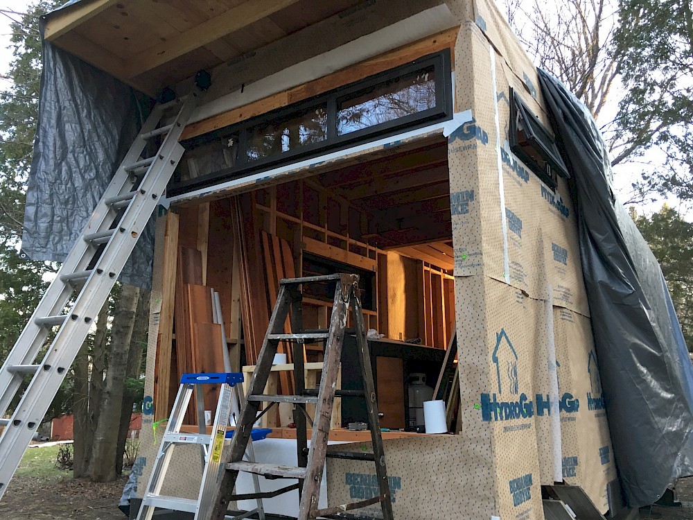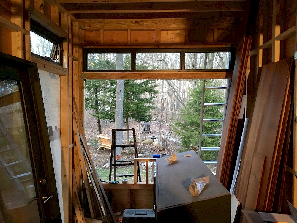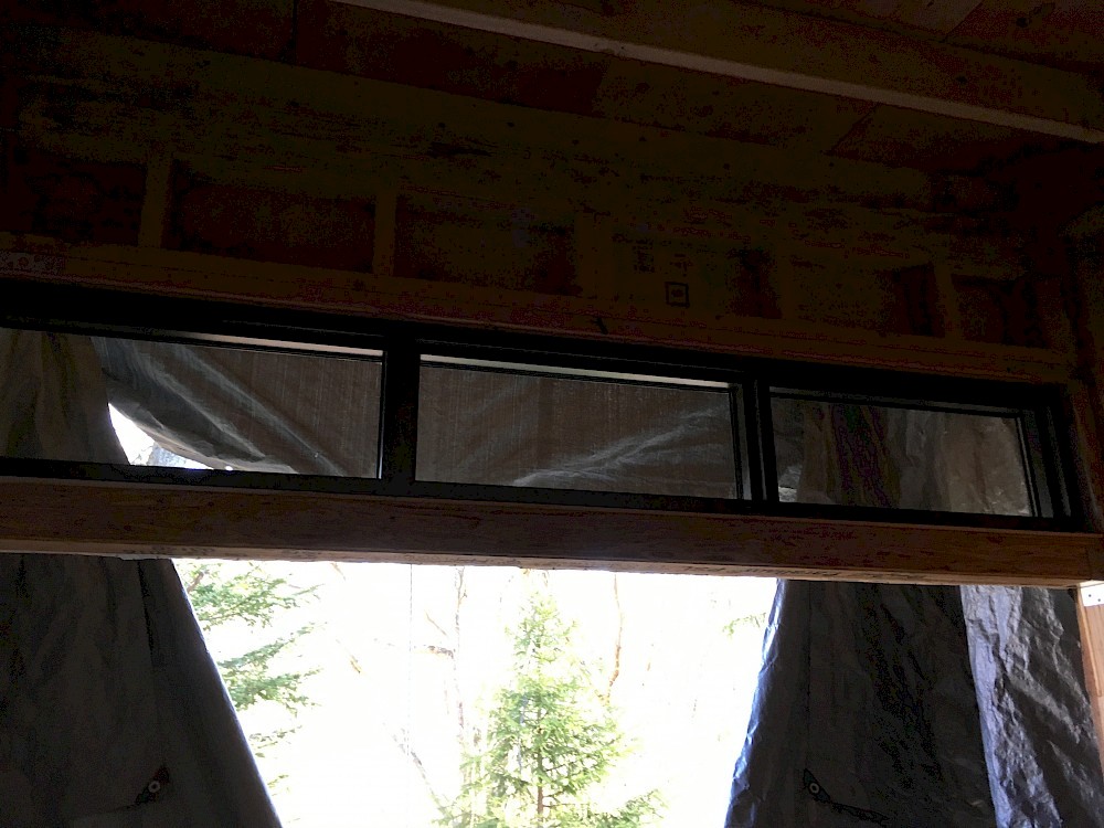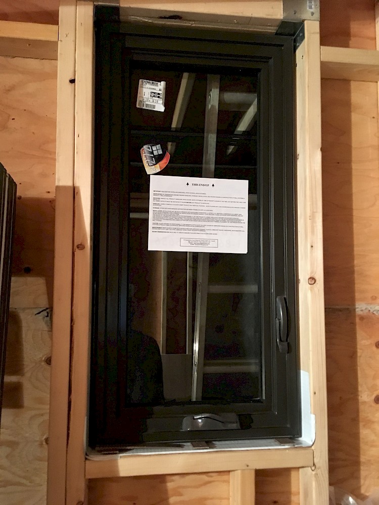 As of this writing (4/10/2017) there have been four more of the total six windows put in place. Only the monster picture window remains (plus two doors, of course) to be installed, and we have not yet planned our exact strategy to accomplish that daunting task. All the windows after the small bathroom one needed two (or three) pairs of hands and more than one ladder for the critical step of lifting them into their openings.