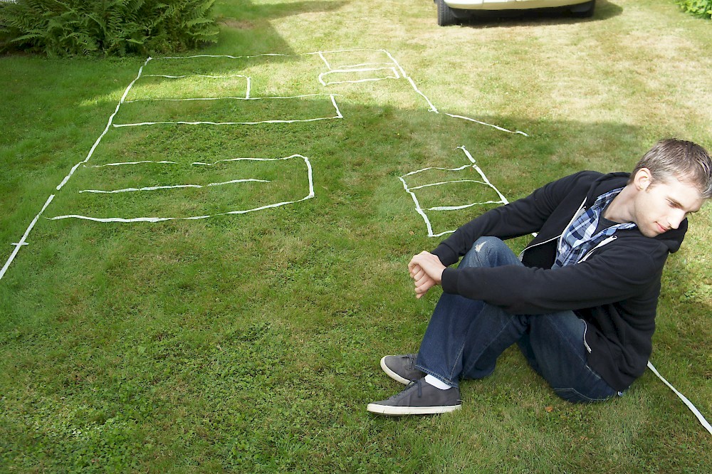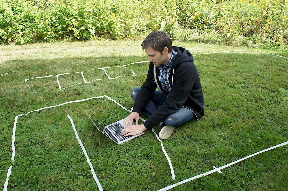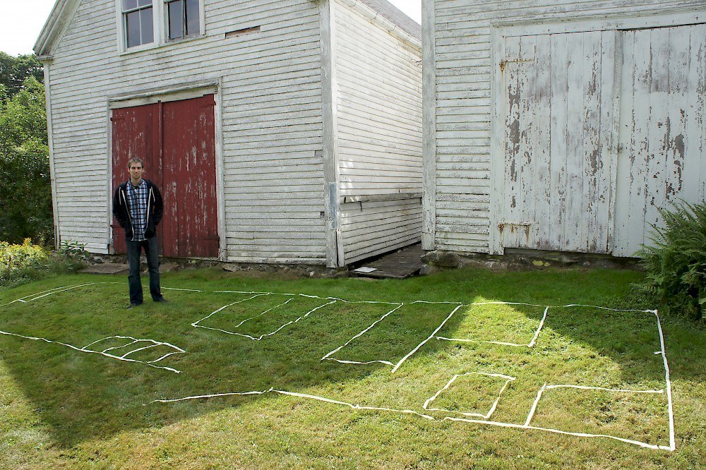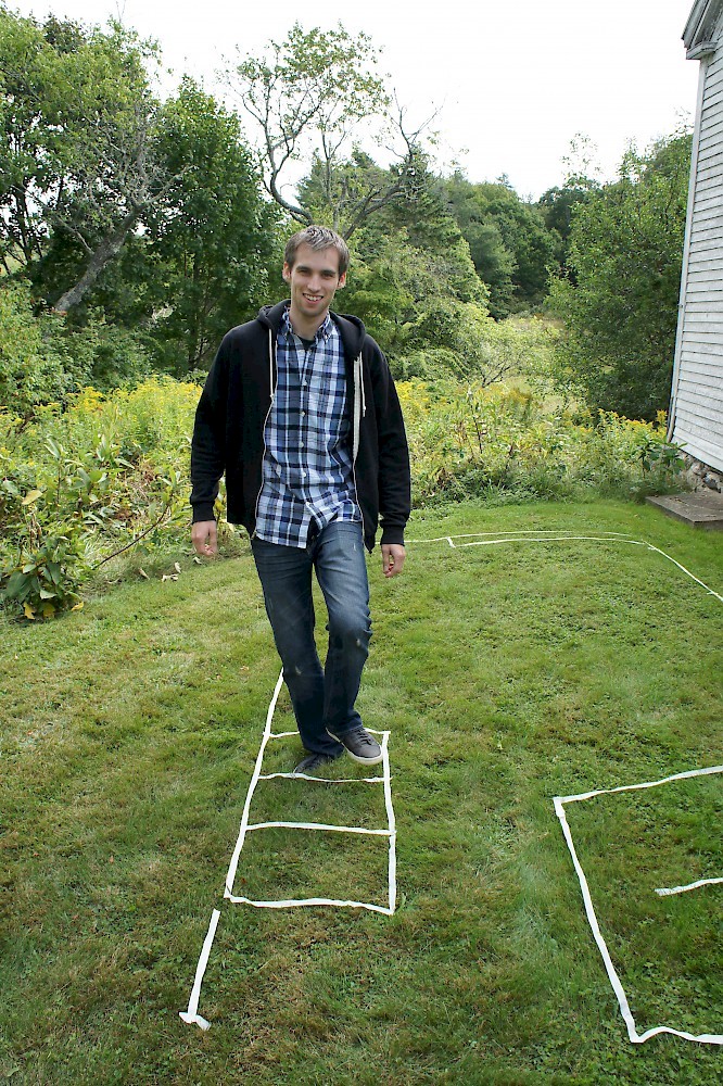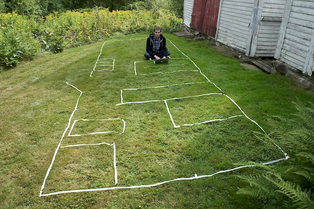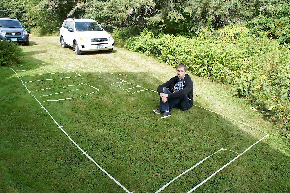 While on vacation in Maine last month I decided to try my tiny house floor plan on for size, inspired by Alek Lisefski’s tiny-project blog. Here’s the result, in photo form. Unfortunately I didn’t have a paved surface to work on, but I managed to make do with the front lawn. Not quite up to par with Alek’s work, however :)