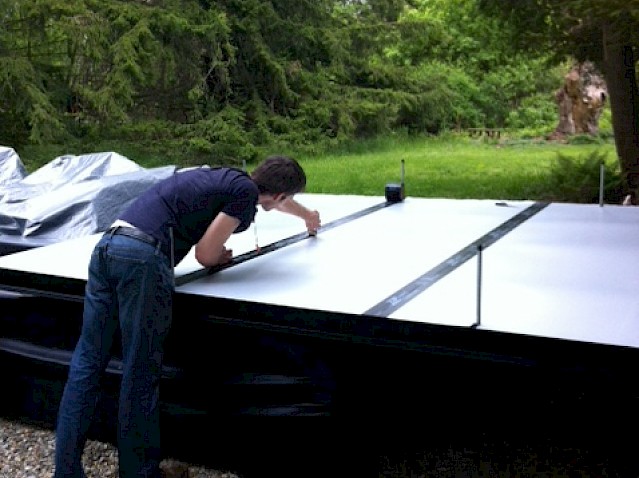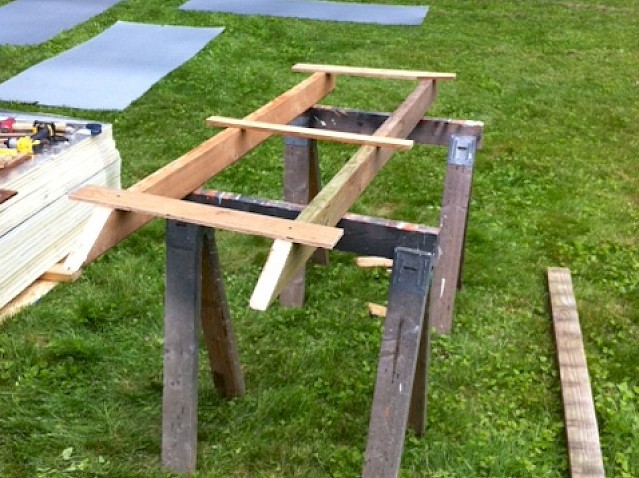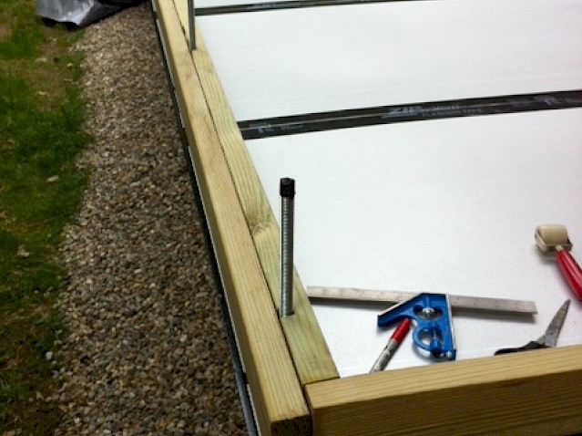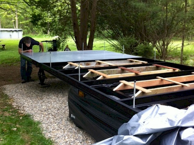 Today, we added more sheets of galvalume, making a total of five out of the eight planned. We then started placing pieces of wood framing (2x4s) around the sides and front of the trailer, on top of the galvalume sheets. Some of the 2x4s had to be notched with vertical channels in them to allow the threaded rods to pass through. We used a router to make the notches.