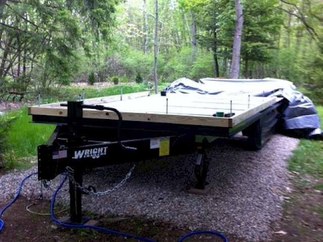 Twelve-foot 2x4 joists will be placed within the perimeter, parallel to sides of trailer. Insulation pieces will be cut to fit between the joists. Some short pieces of 2x4 will be inserted perpendicular to joists and between them, for bracing and subfloor support. Sheet metal pieces will be fastened to joists from underneath.