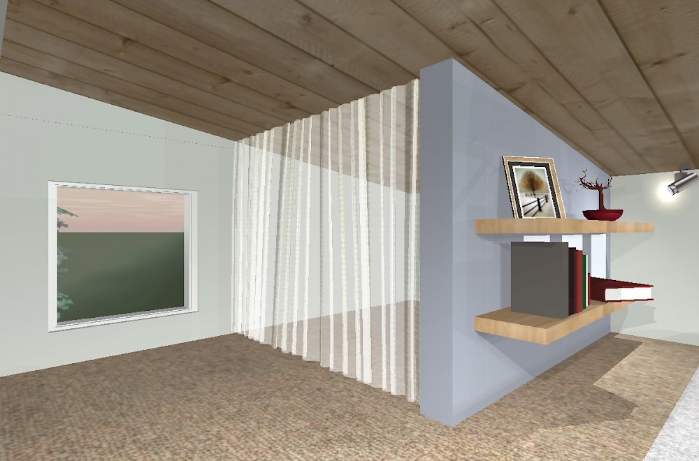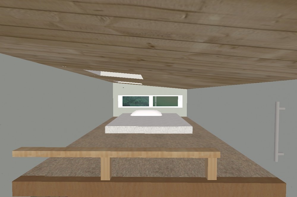 I had thought a lot about how to get up to my loft, but the loft itself was just a stark, open 12’ x 7.5’ space. Although there was a lot of room (enough for 3 twin beds) and plenty of space for extra storage, the only window was at the far end (I didn’t like how additional windows looked from the exterior), and since it took up the entire wall, it made the prospects for using the area for storage awkward. Putting the storage space toward the living room end would block the view to the room below, while putting it on the window end would block the view of the window. Putting storage on the sides would narrow the space, and still run into issues with the window at the end. Something about the whole space just seemed bland and uninteresting, and impractical in spite of its large size.