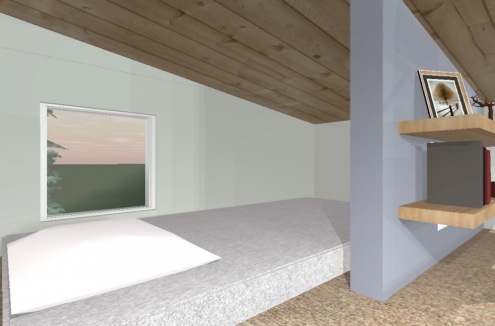 The loft is now partially divided into two areas. The first is a large area capable of comfortably fitting a queen sized mattress, a side table, and some book shelves. The old stout window that used to span the entire back wall has been replaced by a square window (in a sense mirroring the small window on the opposite end of the house) which forms a little “nook” or bay. I think this adds visual interest and an element of fun to the design.